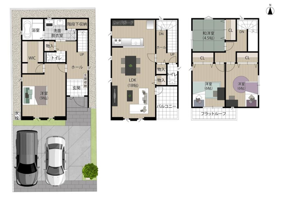 | 間取内容 | LDK18帖 2階 1室洋室9帖 1階 1室洋室6帖 3階 2室和室4.5帖 3階 1室 | ||