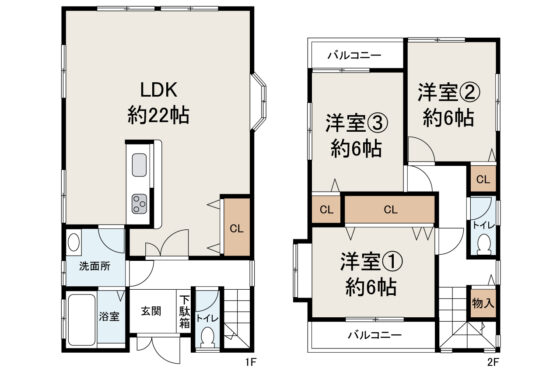 | 間取内容 | LDK22帖 1階 1室洋室6帖 2階 3室 | ||