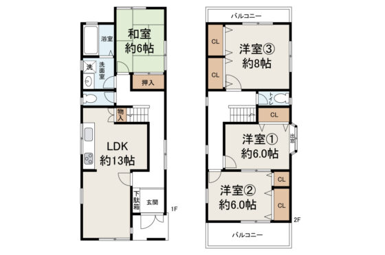| 間取内容 | LDK13帖 1階 1室和室6帖 1階 1室洋室8帖 2階 1室洋室6帖 2階 2室 | ||