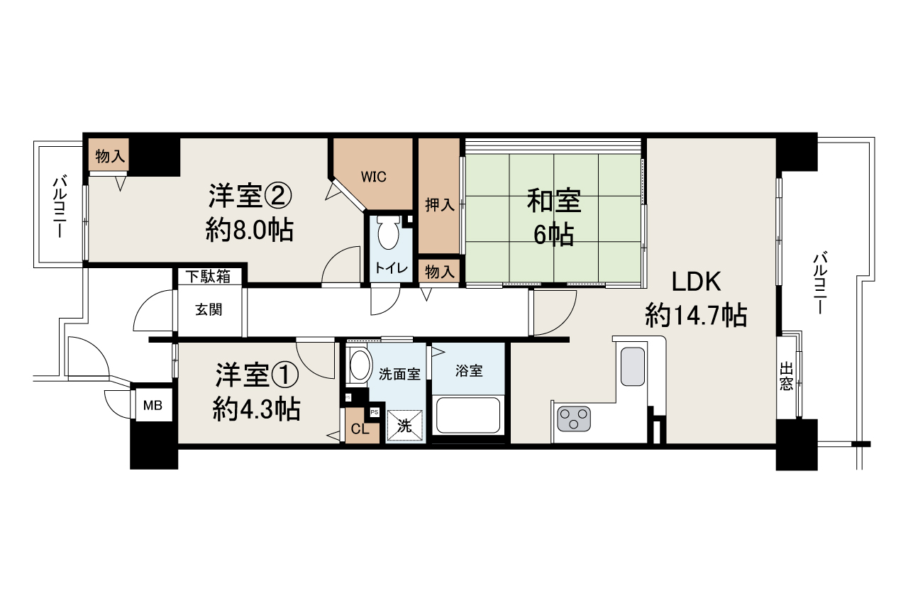 | 間取内容 | LDK14.7帖 1階 1室和室6帖 1階 1室洋室8.0帖 1階 1室洋室4.3帖 1階 1室 | ||